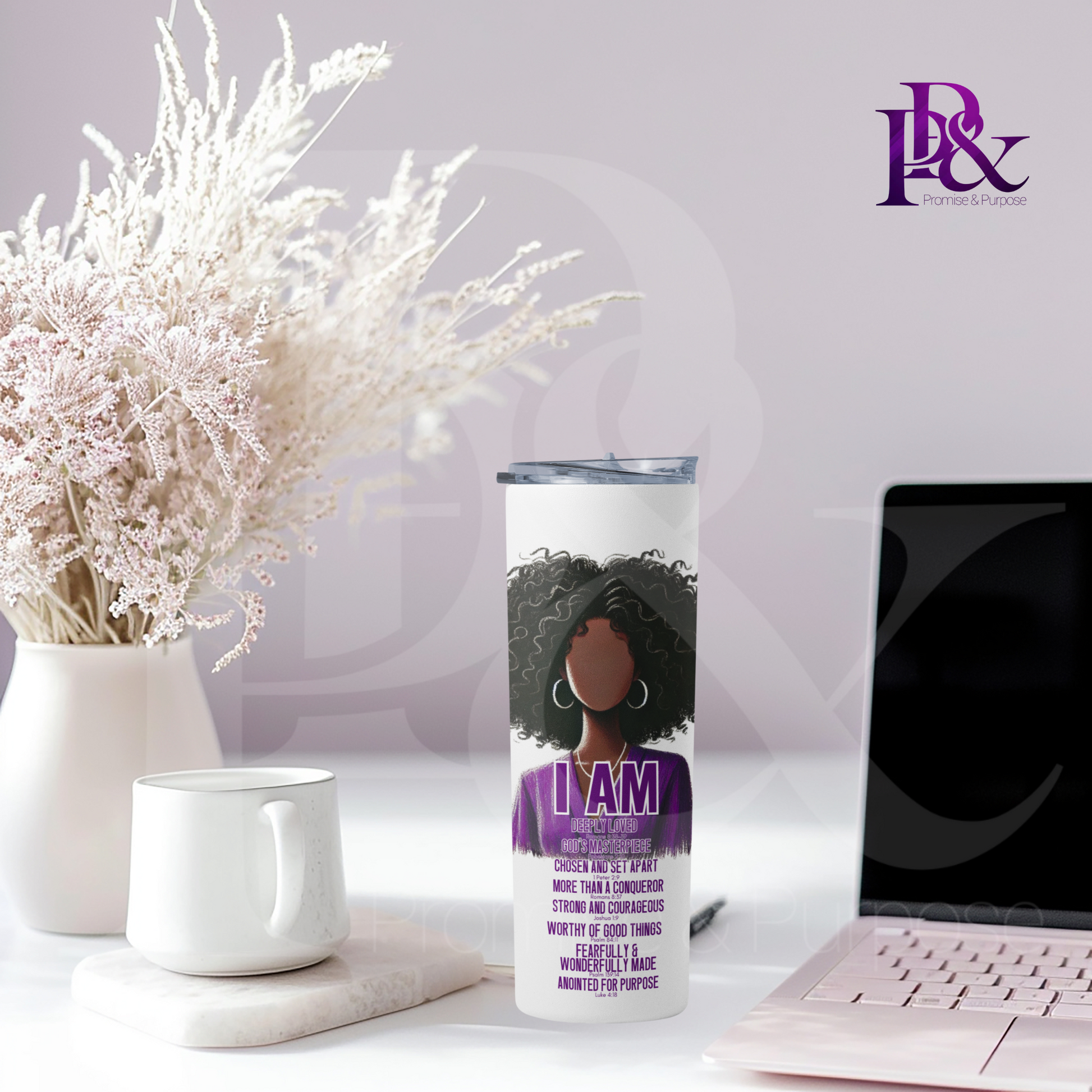 Stay inspired throughout your day with the I am Scripture 20oz Tumbler. Featuring uplifting affirmations paired with meaningful scripture, this faith-based tumbler keeps your favorite beverages at the perfect temperature while serving as a daily reminder of strength and purpose. Its sleek design fits comfortably on your desk or carry it with you for encouragement on the go. Embrace your faith and motivation in every sip.