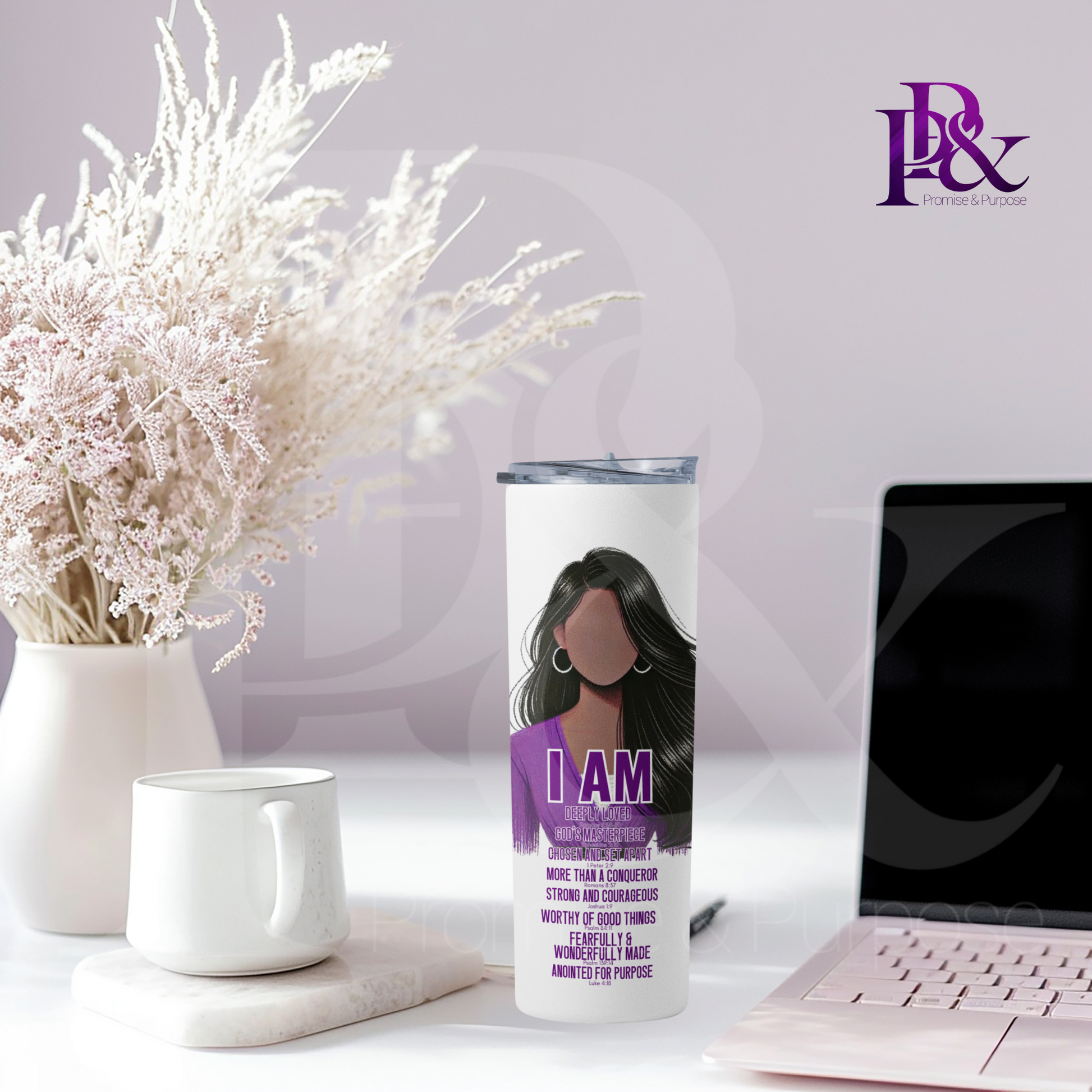 Stay inspired throughout your day with the I am Scripture 20oz Tumbler. Featuring uplifting affirmations paired with meaningful scripture, this faith-based tumbler keeps your favorite beverages at the perfect temperature while serving as a daily reminder of strength and purpose. Its sleek design fits comfortably on your desk or carry it with you for encouragement on the go. Embrace your faith and motivation in every sip.